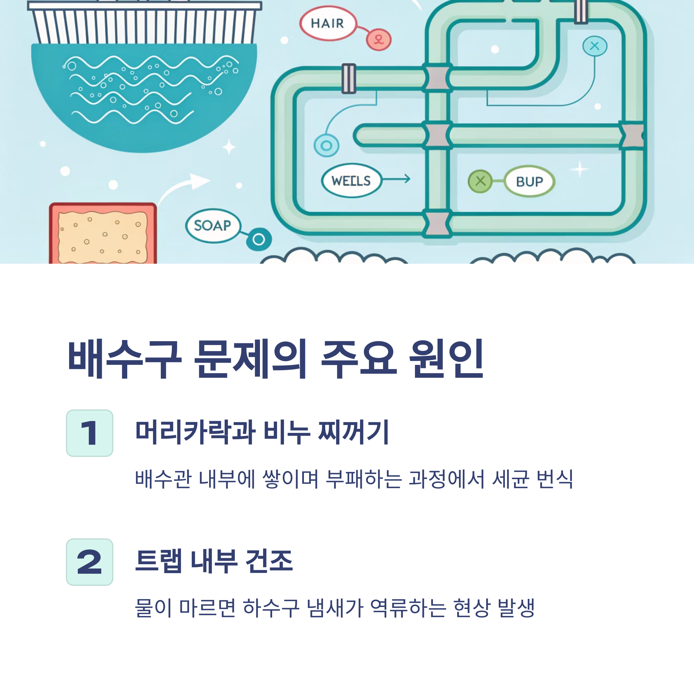 번식하고 악취가 유발되죠. 특히 트랩 내부의 물이 마르면 하수구 냄새가