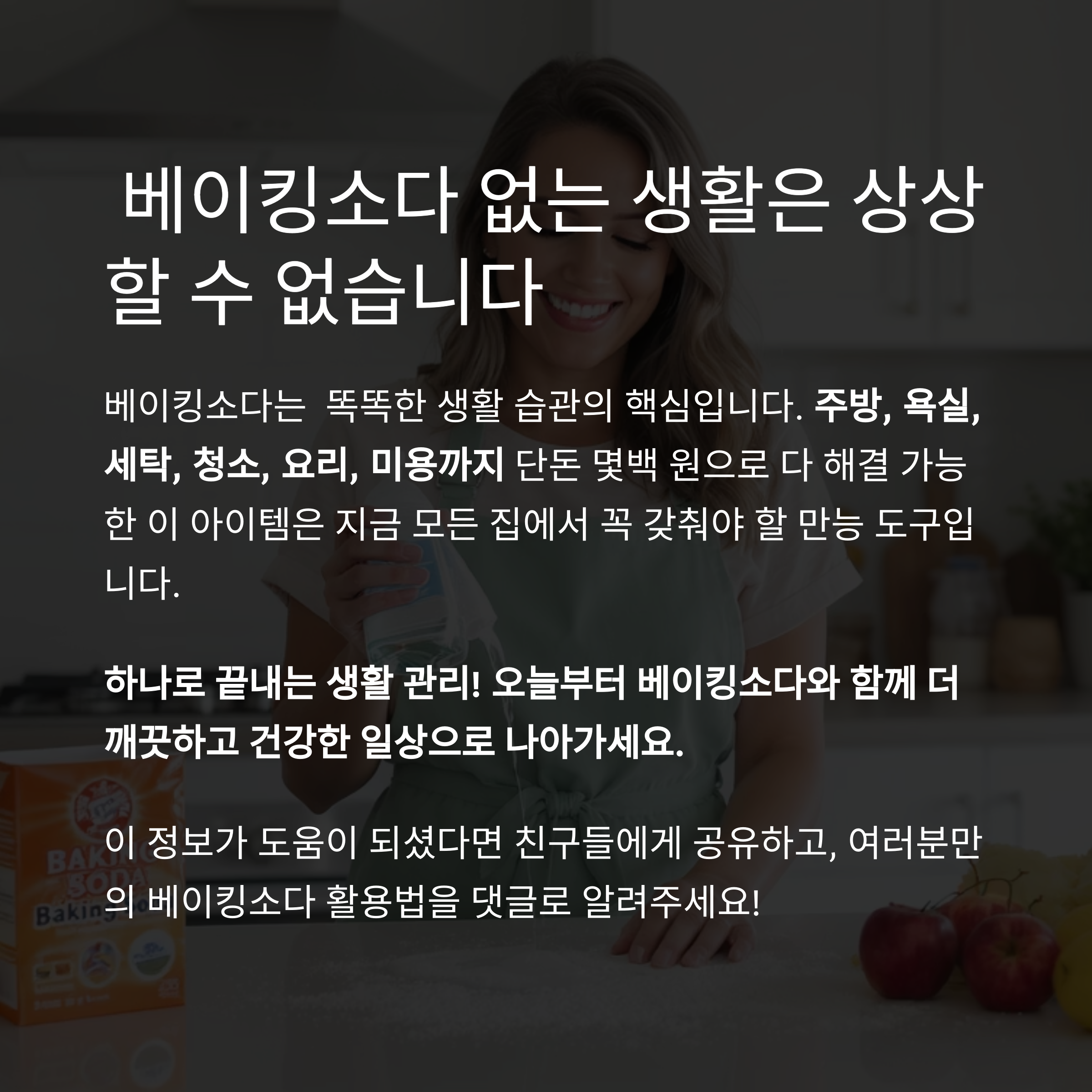 오늘부터 베이킹소다와 함께 더 깨끗하고 건강한 일상으로 나아가세요.