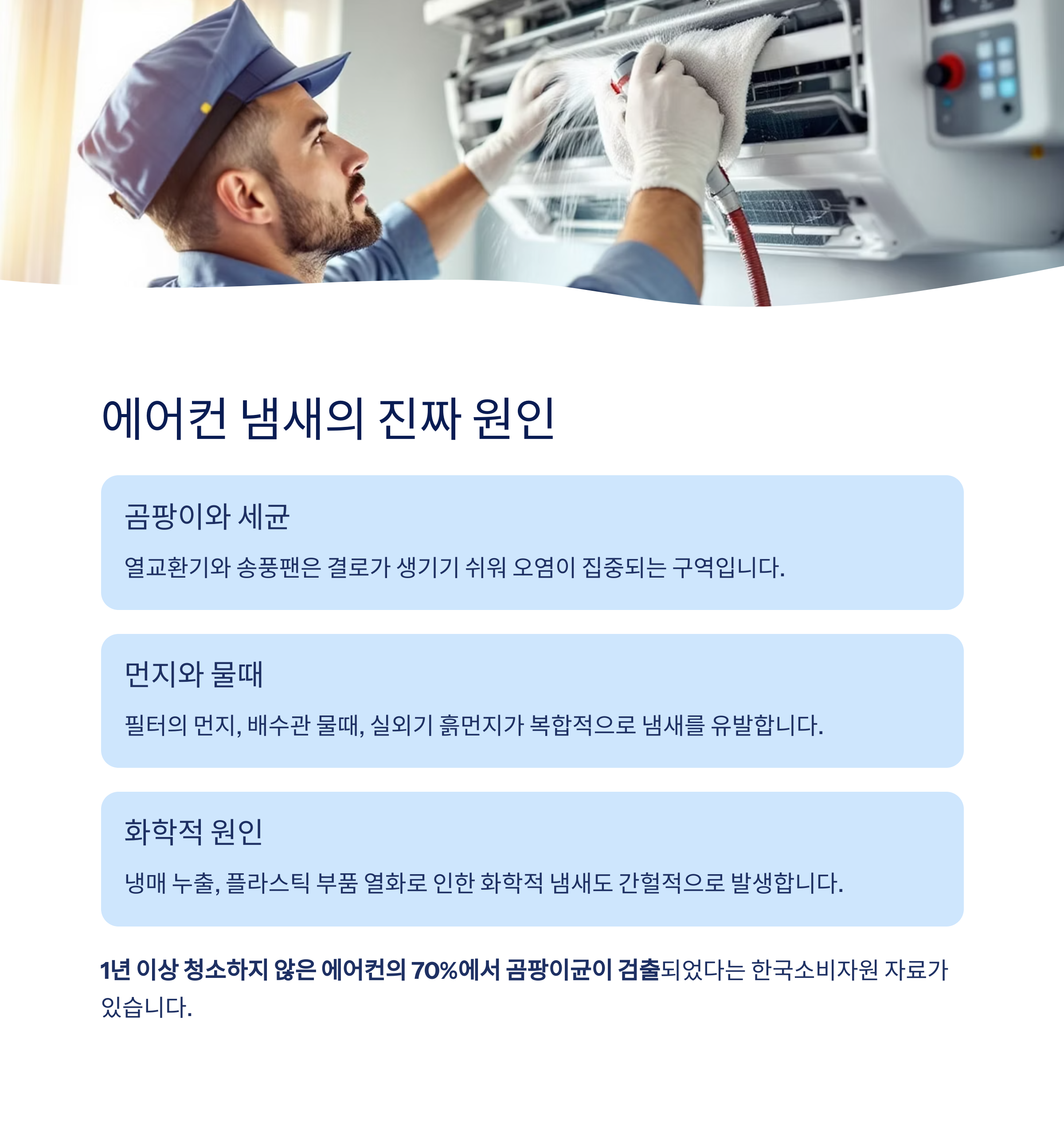 곰팡이, 세균, 먼지 등이 주요 원인이며, 올바른 관리로 충분히 예방과 해결이 가능합니다
