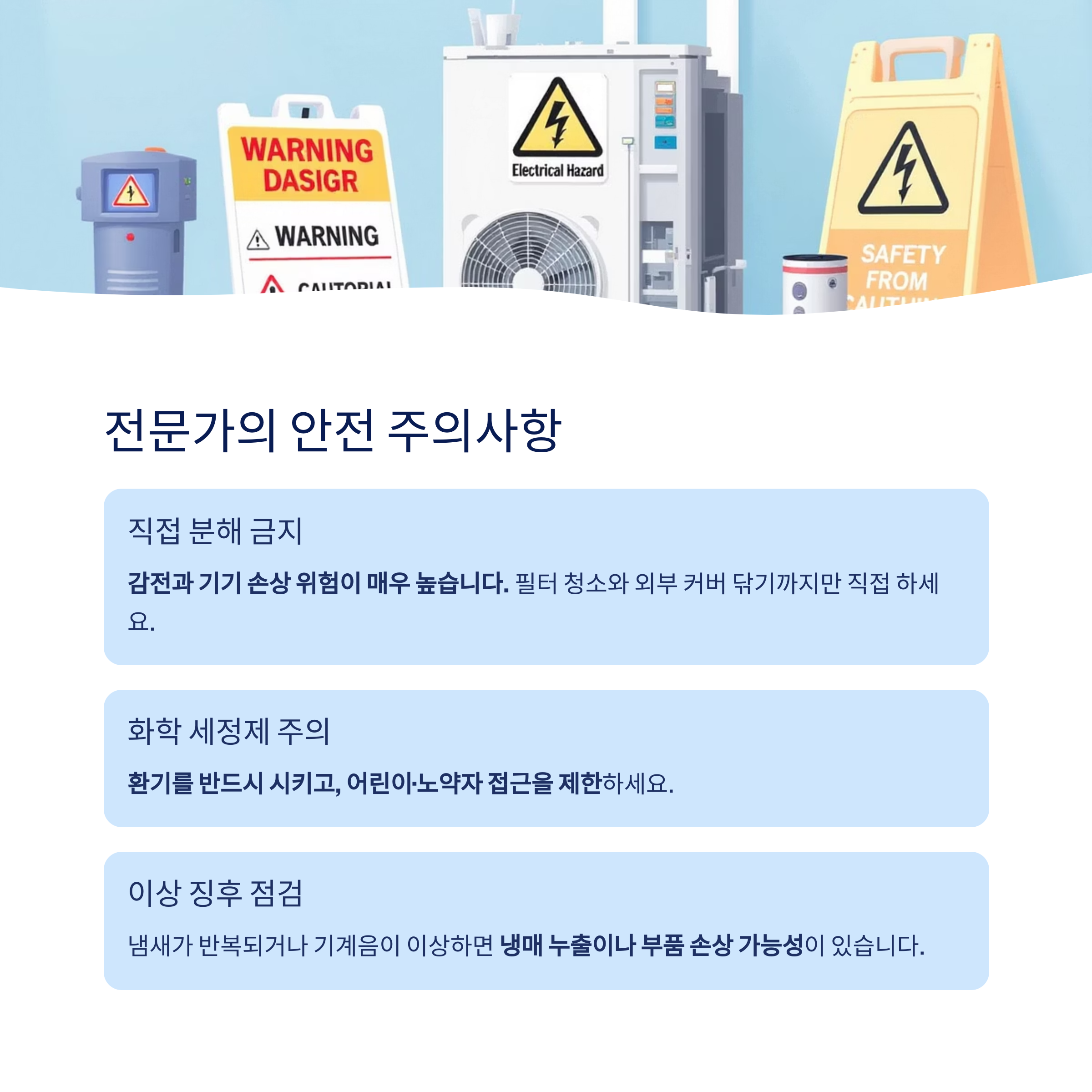 화학 세정제를 사용할 경우 환기를 반드시 시키고, 어린이·노약자 접근을 제한하세요