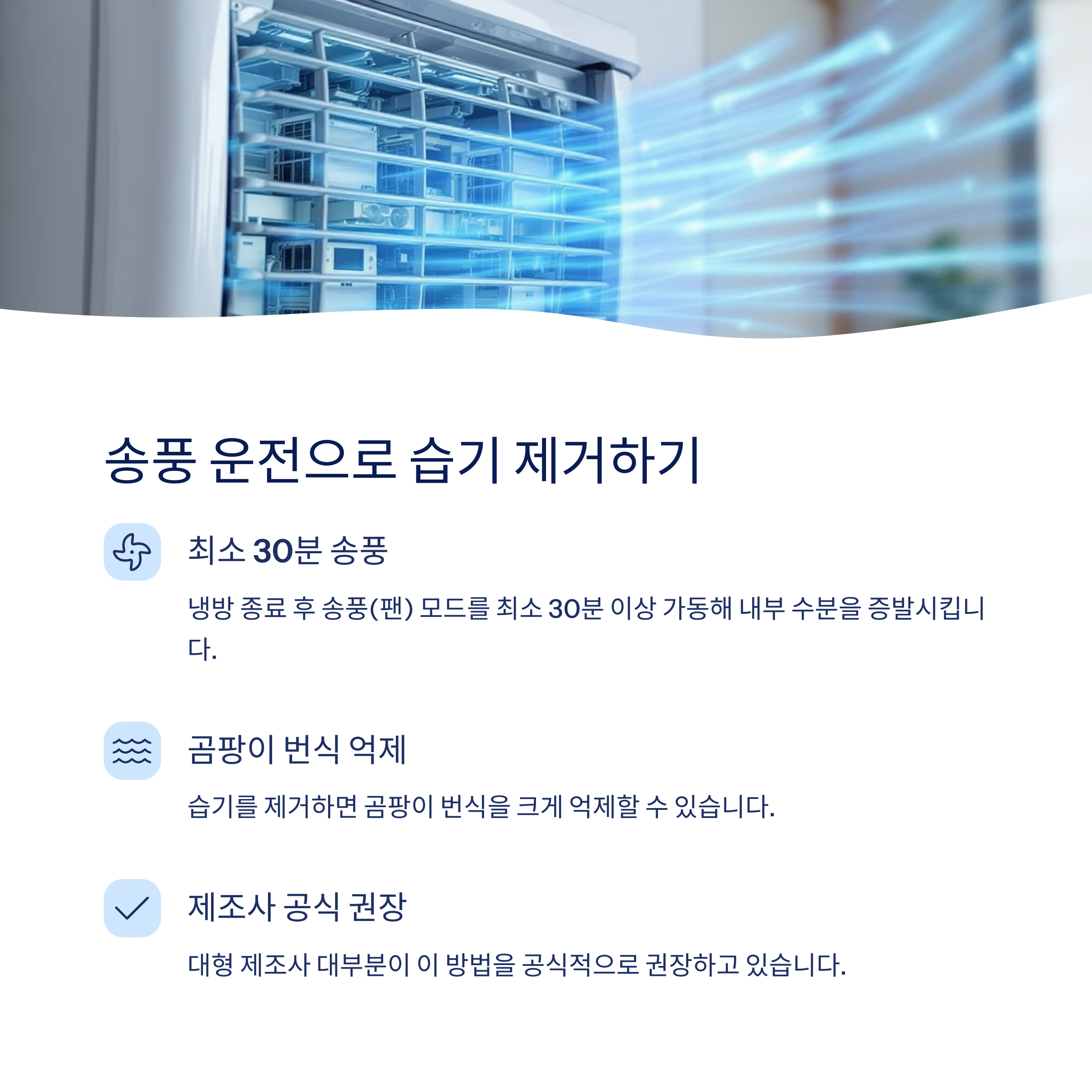 냉방 종료 후 송풍(팬) 모드를 최소 30분 이상 가동해 내부 수분을 증발시킵니다