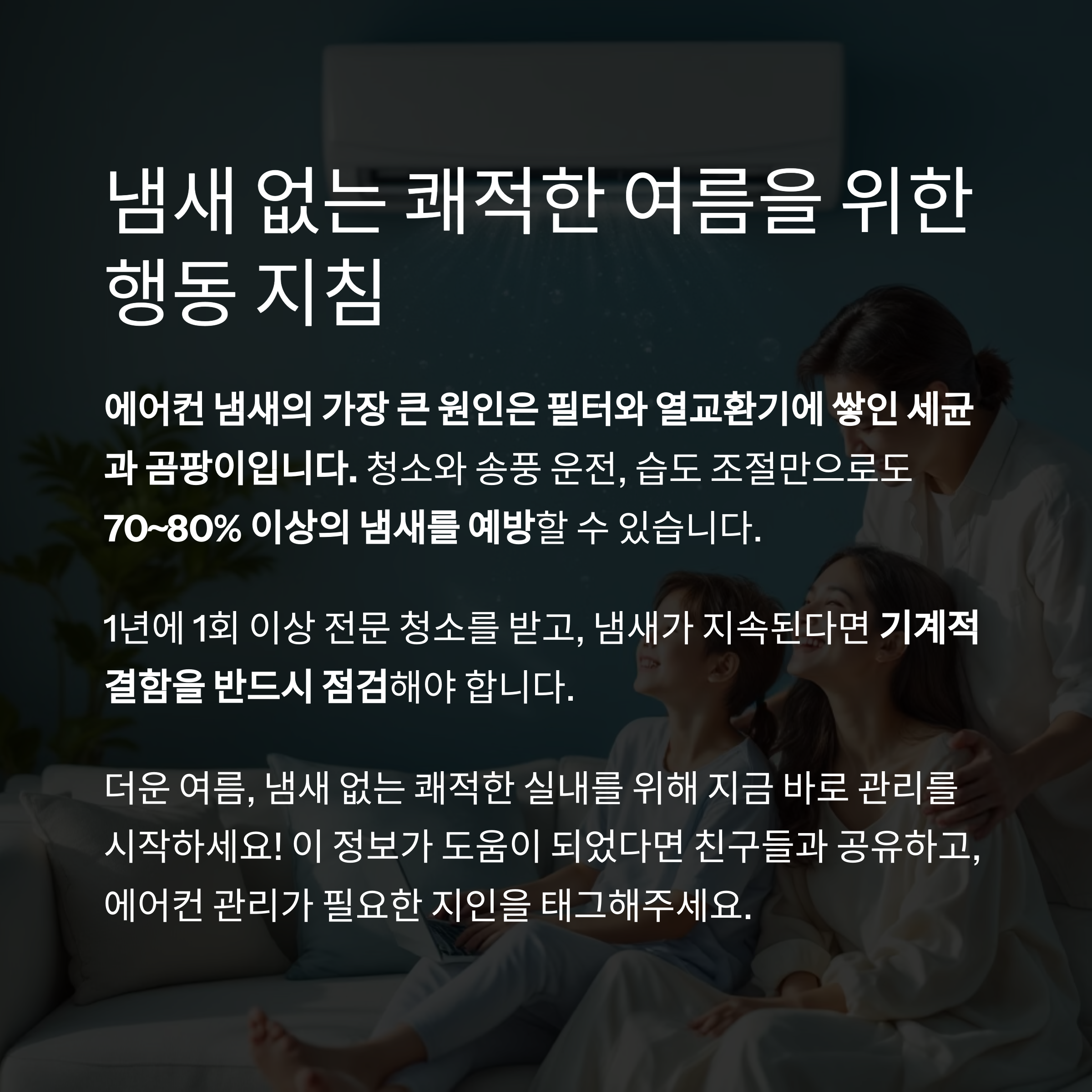 송풍 운전을 습관화하고, 실내 습도를 50% 이하로 유지하는 것도 핵심입니다